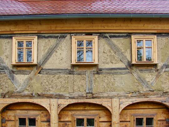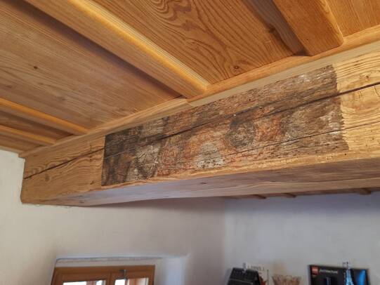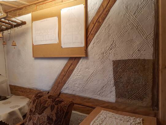 Obergeschoss befinden sich zwei sanierte Zimmer mit einer zusätzlichen Leichtlehmziegelwand, Wandheizung und teilweise erhaltener Bemalung der Deckenbalken von ca. 1750.