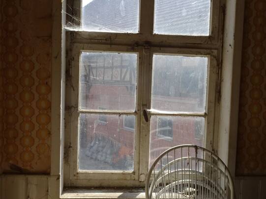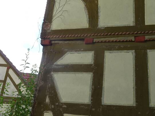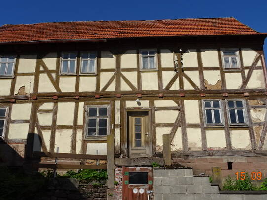 Zustand: befriedigend, Farbe, Putz blättert ab. Fachwerk kleinere Schäden